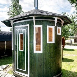 Vertikal badstue tønne er laget av gran. Etter kundens ønske, kan vi installere en vedfyrt ovn eller en elektrisk varmeovn i badstuen. Taket er dekket med takpapp, og det kan velges mellom fargene: svart, rød eller grønn.