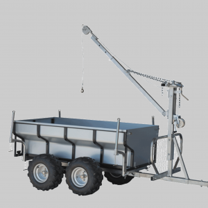 Plan med tipp, som enkelt kan demonteres. Svingbart teleskopisk vinsjtårn, gittervegg, fire tømmerstaker, roterende drag og boggihjul med pendelfunksjon.