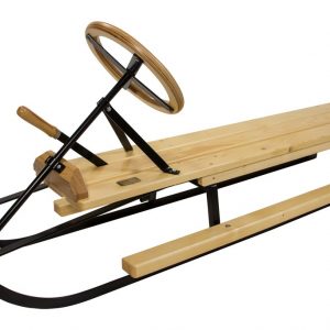 Laget i lakkert treverk, svartlakkert stål og med meier av fjærstål. Solid håndbrems og bra sving. L: 100 cm.