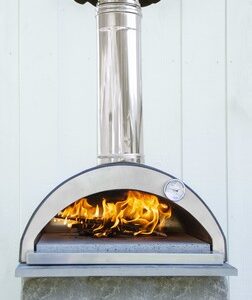 Vedfyrt steinovn i rustfritt stål med innebygd termometer.