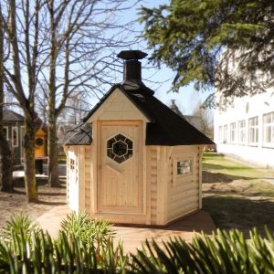 Den sekskantede grillhytta har en grunnflate på 4,5 kvadratmeter, og det er ikke nødvendig å søke om byggetillatelse dersom man setter den opp på privat tomt.