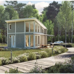 Lite moderne hus med hems laget i gran.